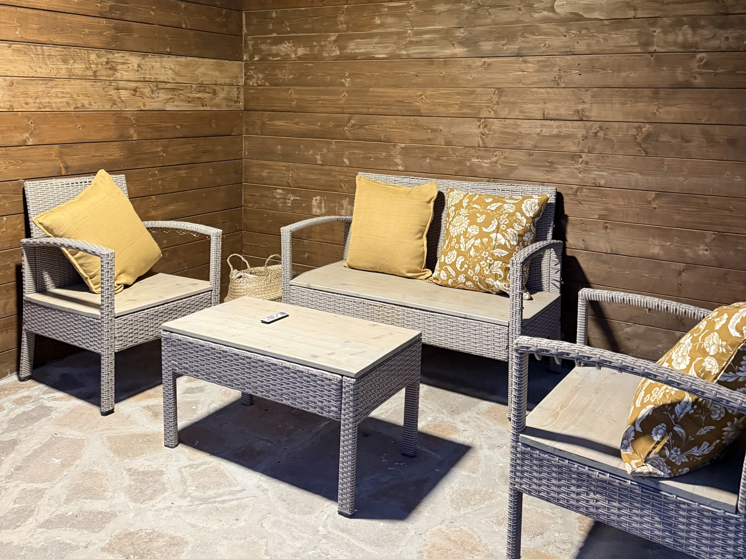 L’interno, con tetto in legno a vista, regala un’atmosfera calda e intima, perfetta per chi cerca una fuga rilassante. L’appartamento è composto da una luminosa zona living con cucina attrezzata, un bagno con doccia e un’area notte open space in stile studio. Il design contemporaneo incontra il calore dei materiali naturali, creando un ambiente unico e suggestivo.