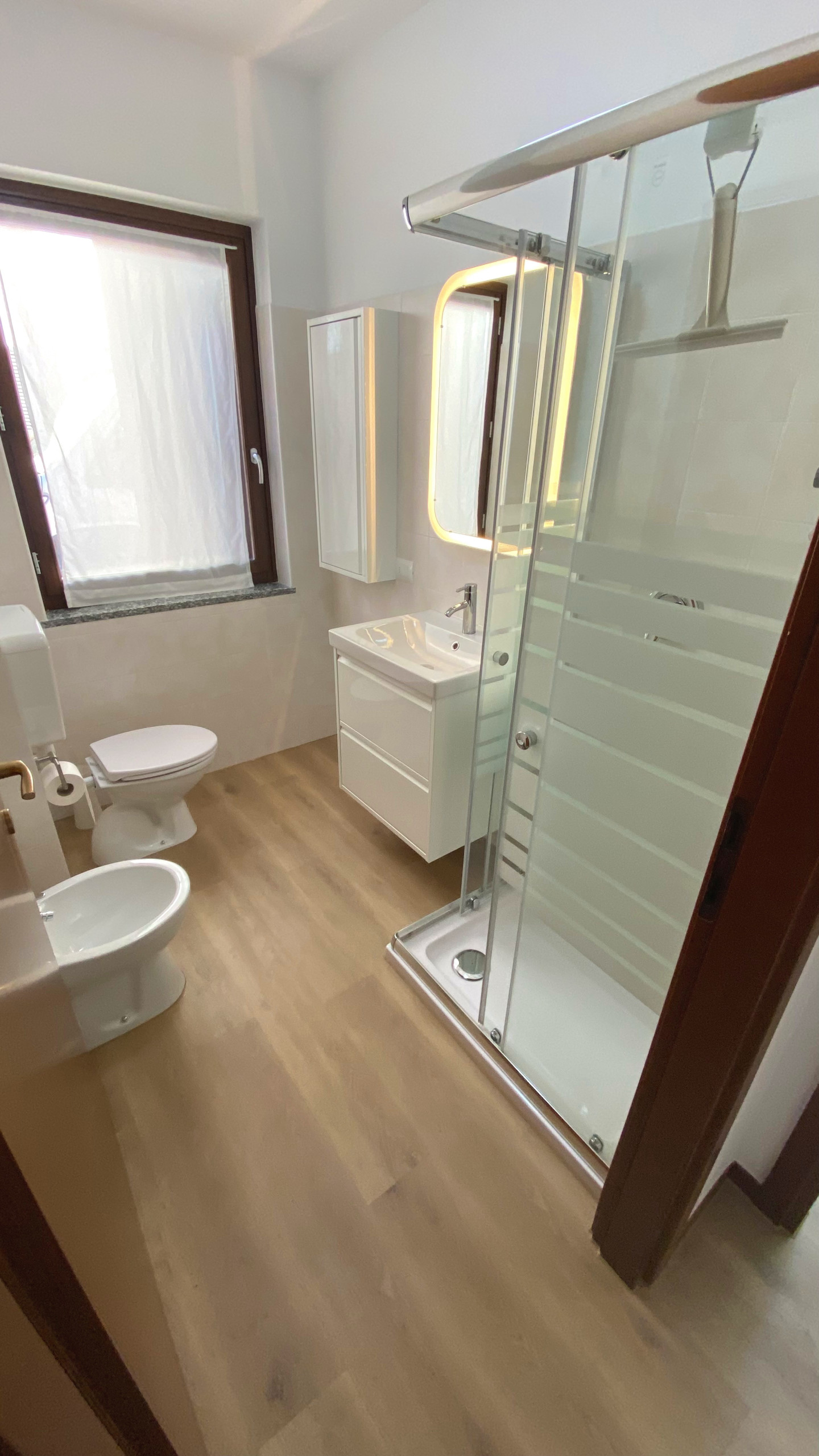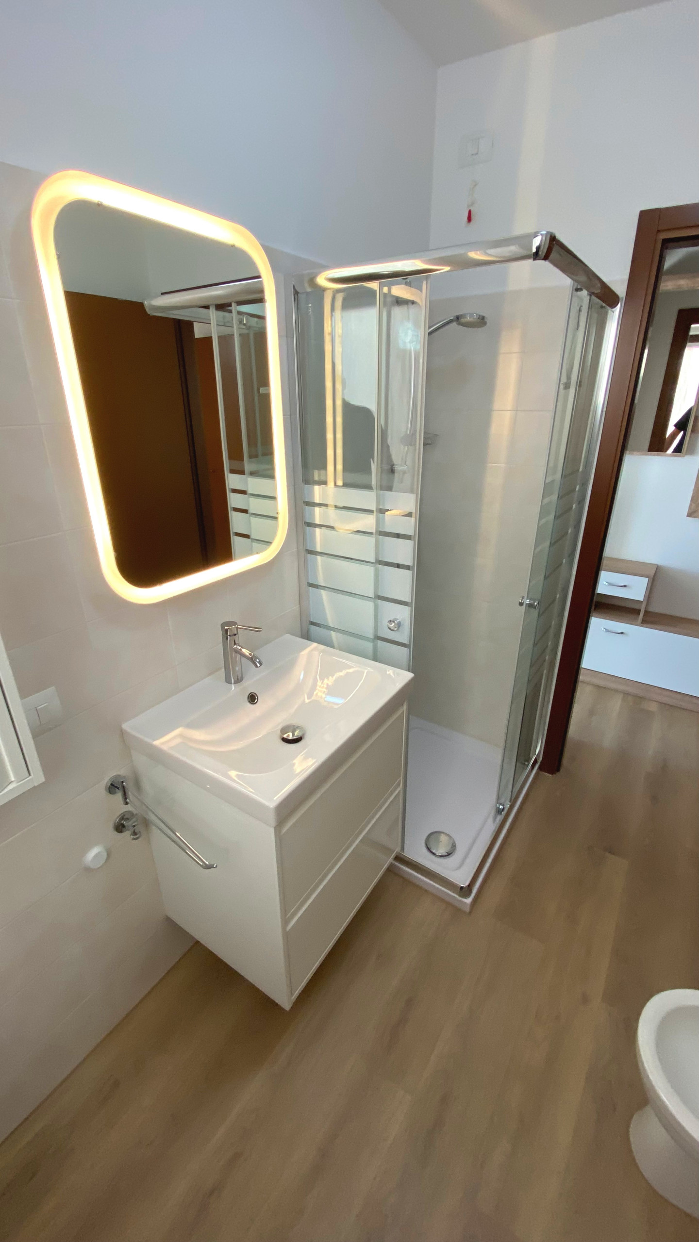 Das Appartement ist Klasse und es sieht genauso so aus wie auf den Bildern. Vor dem Eingang ist eine Terrasse die mit Kunstrasen ausgelegt ist. Es sind 1 Tisch 2 Stühlen (aus Aluminium), Sonnenschirm und Wäscheständer vorhanden. Wenn man durch die doppelte Flügeltür eintritt, steht man in dem Wohnraum mit Küchenzeile mit Mikrowelle mit Grillfunktion, 1 Esstisch, 4 Stühlen, 1 ausziehbares Schlafsofa, Fernseher und ausreichend Schränken. Die Küche hat 1 Kühl- und 1 Gefrierschrank, Induktionsherd und Backofen und alles was man zum Kochen, Braten und Essen benötigt. Einzig eine Kaffeemaschine, Kaffekanne und Wasserkocher fehlen. Wir haben unseren Kaffee auf unserer mitgebrachten Kaffeekanne durch den vorhandenen Kaffeefilter durchlaufen lassen, das Wasser dazu haben wir im vorhandenen Kochtopf aufgekocht, was wiederum einen gewissen Charme hatte. Durch einen kleinen Flur gelangt man in das Schlafzimmer mit Doppelbett, 2 Nachtschränkchen und 2 Nachttischlampen und 1 großen Kleiderschrank. Ebenfalls von dem kleinen Flur gelangt man in das Badezimmer mit Dusche. Zur Ankunft waren wir per WhatsApp mit Ottavio in Kontakt. Er hatte uns morgens gefragt, wann wir ankommen und nochmal kurz vor der Ankunftszeit, ob wir bereits in der Nähe sind. Bei der Ankunft standen wir vor einem verschlossenen Tor zu der Anlage. Doch mit den Erläuterungen und der Infomappe erhält man die Codes für das Tor, welches stets geschlossen ist. Ottavio hat uns sehr freundlich empfangen und uns quasi eingeführt.