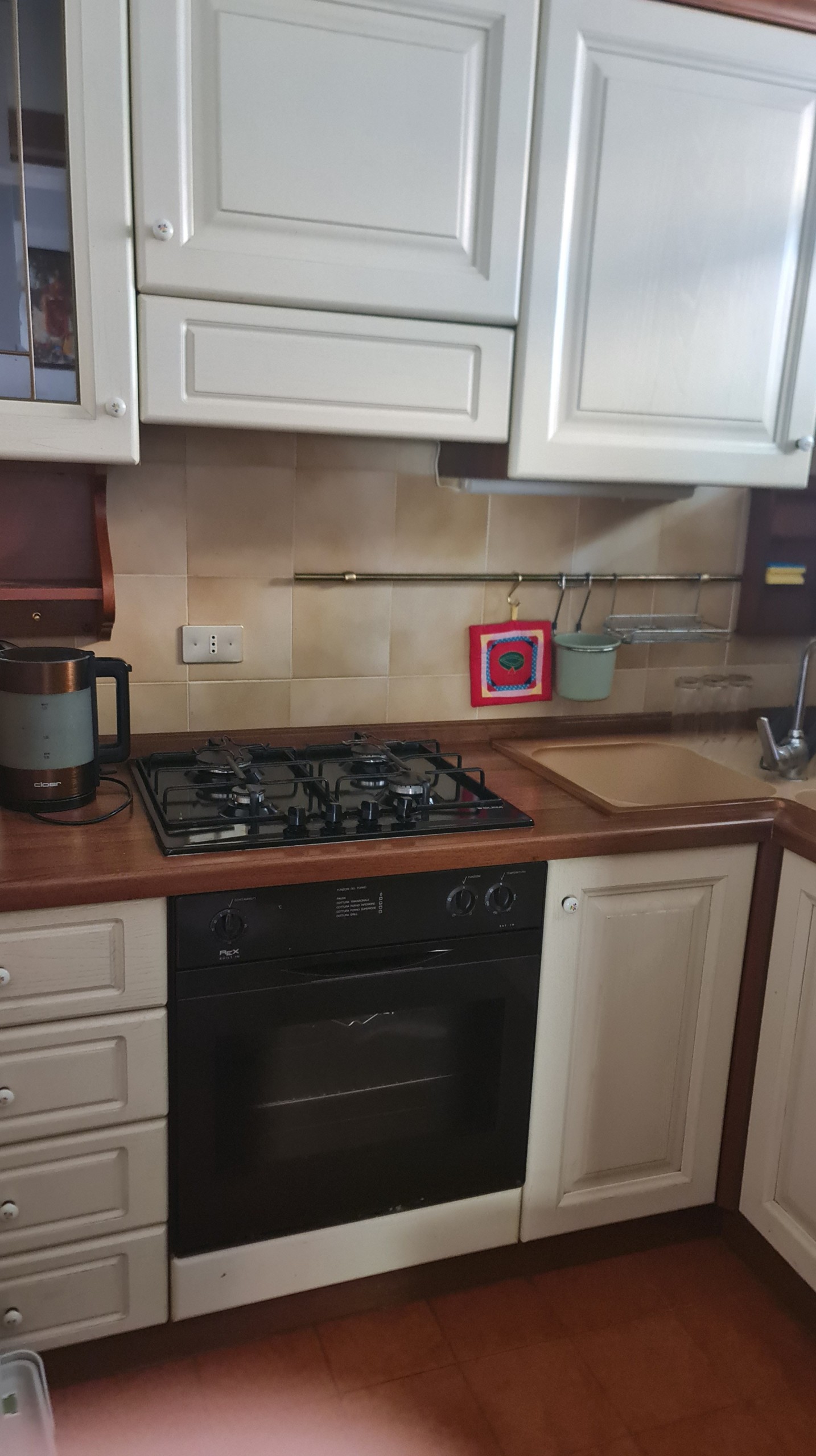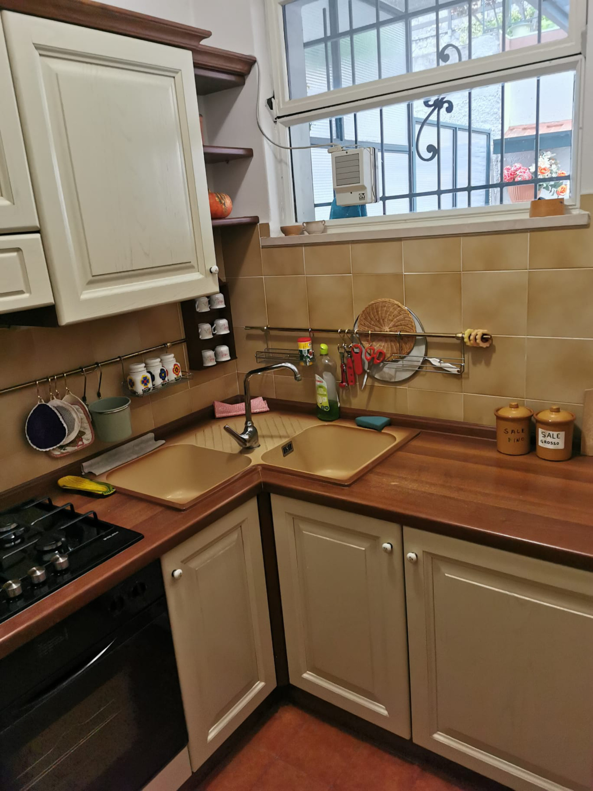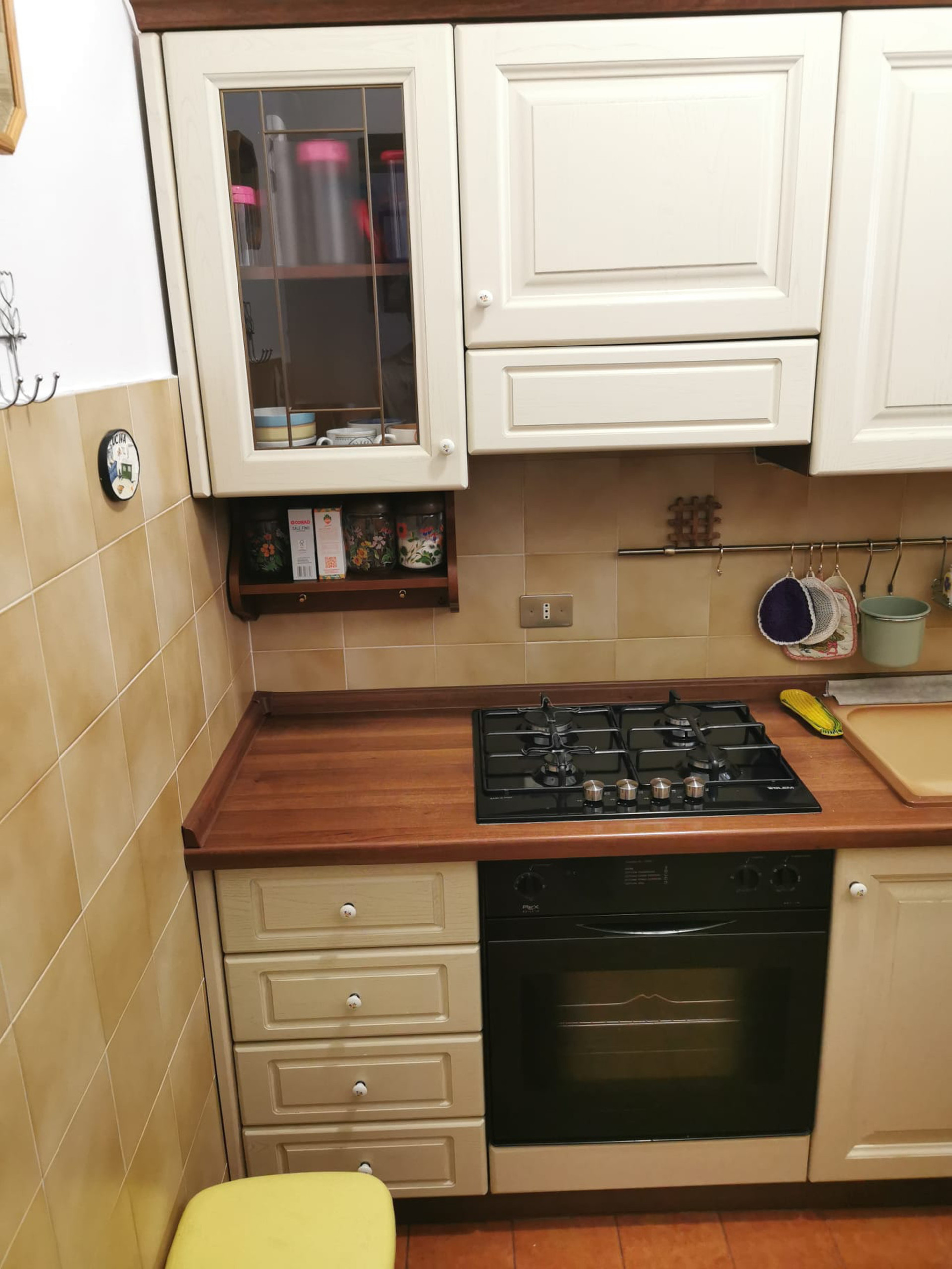 The fully equipped kitchen, with all necessary appliances: refrigerator, freezer, washing machine, coffee machine, oven, Ideal for feeling at home.